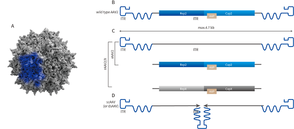 • 腺相关病毒(adeno-associated virus, AAV)是微小病毒科(parvoviridae)家族的成员之一,是一类无法自主复制、无被膜的二十面体微小病毒,其直径约20-26nm,含有4.7kb左右的线状单链DNA作为基因组。研究中采用的重组腺相关病毒载体(recombination adeno-associated virus, rAAV)是在非致病的野生型AAV基础上改造而成的基因载体,由于其种类多样、免疫原性极低、安全性高、宿主细胞范围广(对分裂细胞和非分裂细胞均具有感染能力)、扩散能力强、体内表达基因时间长等,rAAV被视为最有前途的基因研究和基因治疗载体之一。