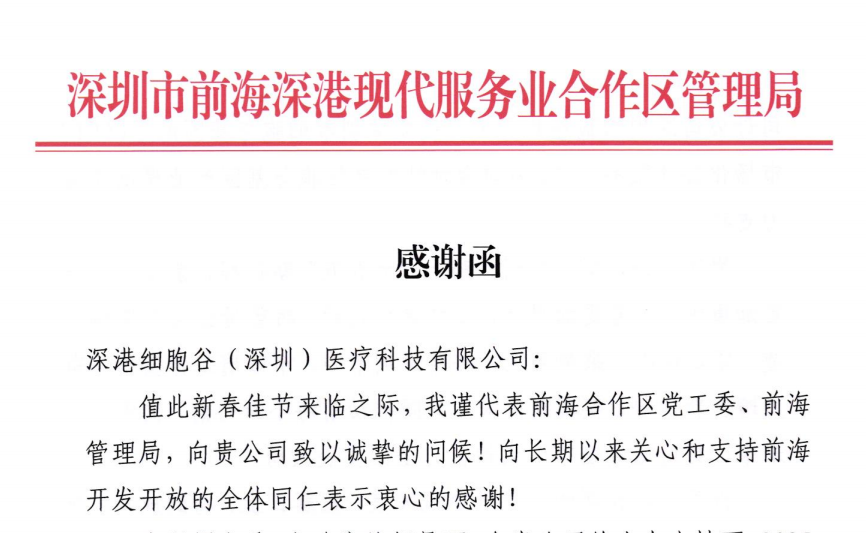 Recently, Shenzhen-Hong Kong Cell Valley (Shenzhen) Medical Technology Co., Ltd. received a letter of thanks from the Qianhai Shenzhen-Hong Kong Modern Service Industry Cooperation Zone Administration. The letter was signed by Comrade Wang Shourui, member of the Standing Committee of the Shenzhen Municipal Committee, Secretary and Director of the Qianhai Administration Bureau, fully affirming the series of achievements the company has achieved since its establishment in Qianhai in 2025, and placing high expectations for the company's future development.
