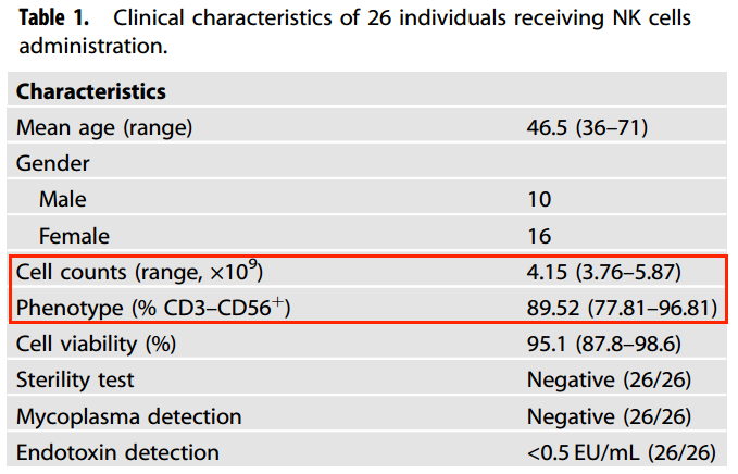 近期我国学者研究发现,利用NK细胞召开回输治疗,成功杀死了小鼠或人体内的衰老细胞,并发现在联合一种多巴胺释放肽后,NK细胞的衰老细胞清除能力得到了显著提升[4]。该研究招募了26名接受NK细胞输注的志愿者。外周血NK细胞的比例和绝对数量以及输注到每个个体中的NK细胞产物的纯度与志愿者的年龄呈负相关。志愿者的特征及NK细胞特性如下表所示: