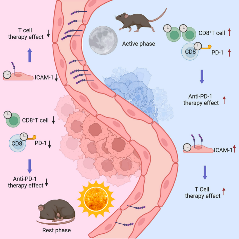 免疫疗法是现在对抗癌症最有效的手段之一,相关研究表明免疫细胞在不同时间段可表现出不同的细胞迁移特性和表型,其抗肿瘤效果会因使用的时间段不同而产生差异。近期《Cell Press》发表的“Circadian tumor infiltration and function of CD8+ T cells dictate immunotherapy efficacy”就揭示了昼夜节律对肿瘤浸润性免疫细胞的细胞数量以及细胞表型的影响,并提出了更优的细胞治疗时间段。