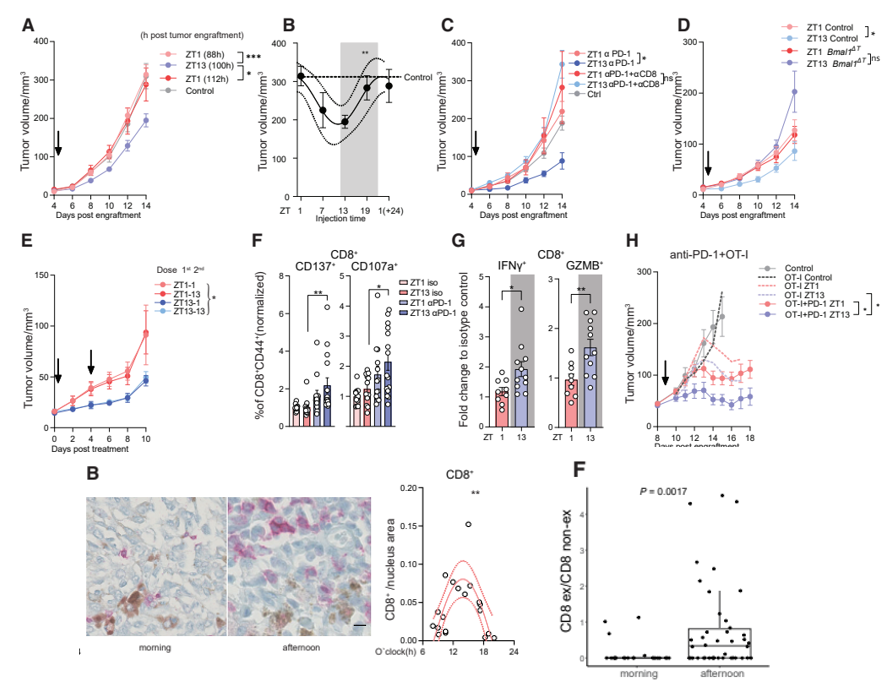 为了探究时间节律是否影响PD-1抗体治疗的效果,作者构建了黑色素瘤小鼠,并发现ZT1时间段注射PD-1抗体的效果不如ZT13时间段给药,且这一注射时间的不同,持续影响其后十数日的抗肿瘤效果。进一步的实验表明,注射PD-1抗体后,在ZT13时间段分离出来的肿瘤内CD8+T细胞在分泌能力和因子表达上稍强。最后,作者收集了不同时间段切除的黑色素瘤样本,顺利获得分析样本的转录组数据,作者发现时间节律对淋巴细胞的影响同样在人身上存在。其中,作者着重提及了尽管CD8+T细胞在人黑色素瘤的浸润顶峰是下午早段,但这一时间的肿瘤内CD8+T细胞的耗竭程度也会更高。