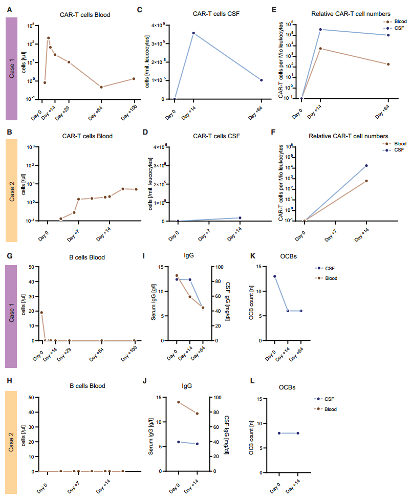 在这两种病例中,相较于于外周血,CAR-T细胞在脑脊液(CSF)中的存在和靶标驱动的扩增在第14天均得到了证实。与外周血中的CAR-T扩增情况类似,在CSF中,患者1的CAR-T扩增倍数大于64倍,患者2的扩增倍数大于27倍,患者1的CAR-T细胞在CSF中扩增更明显。